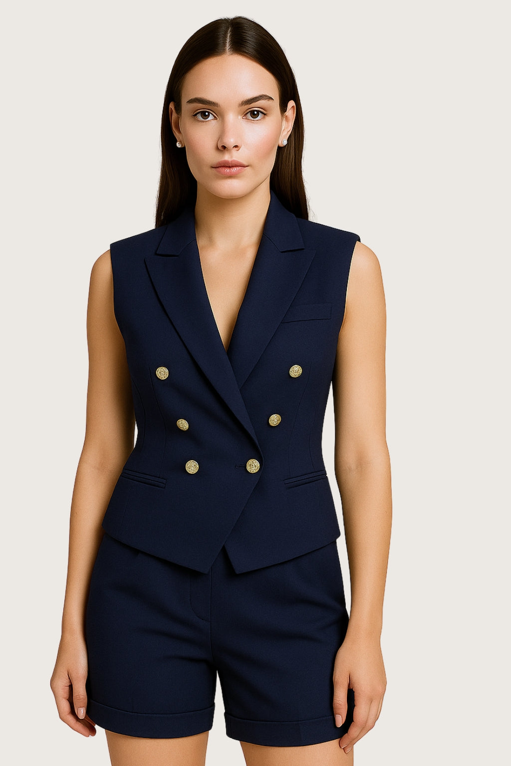 Denne ærmeløse blazer-vest i navy blå er det perfekte statement piece til den ambitiøse kvinde....