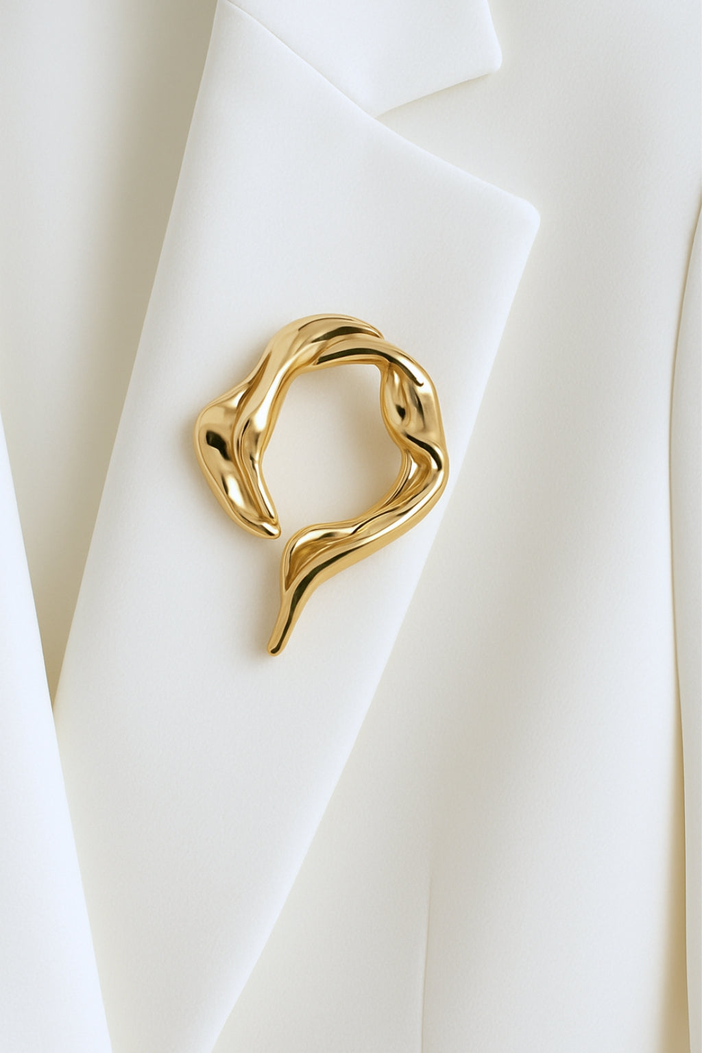 Dette statement-smykke er perfekt til at pifte enhver blazer, jakke eller kåbe op og sidder smukt på reversen, som vist. Den gyldne farve står i smuk kontrast til mørke stoffer som navy, sort eller mørkegrå, og den organiske form giver et sofistikeret og kunstnerisk udtryk. Den er ideel til både professionelle lejligheder og elegante aftenselskaber.