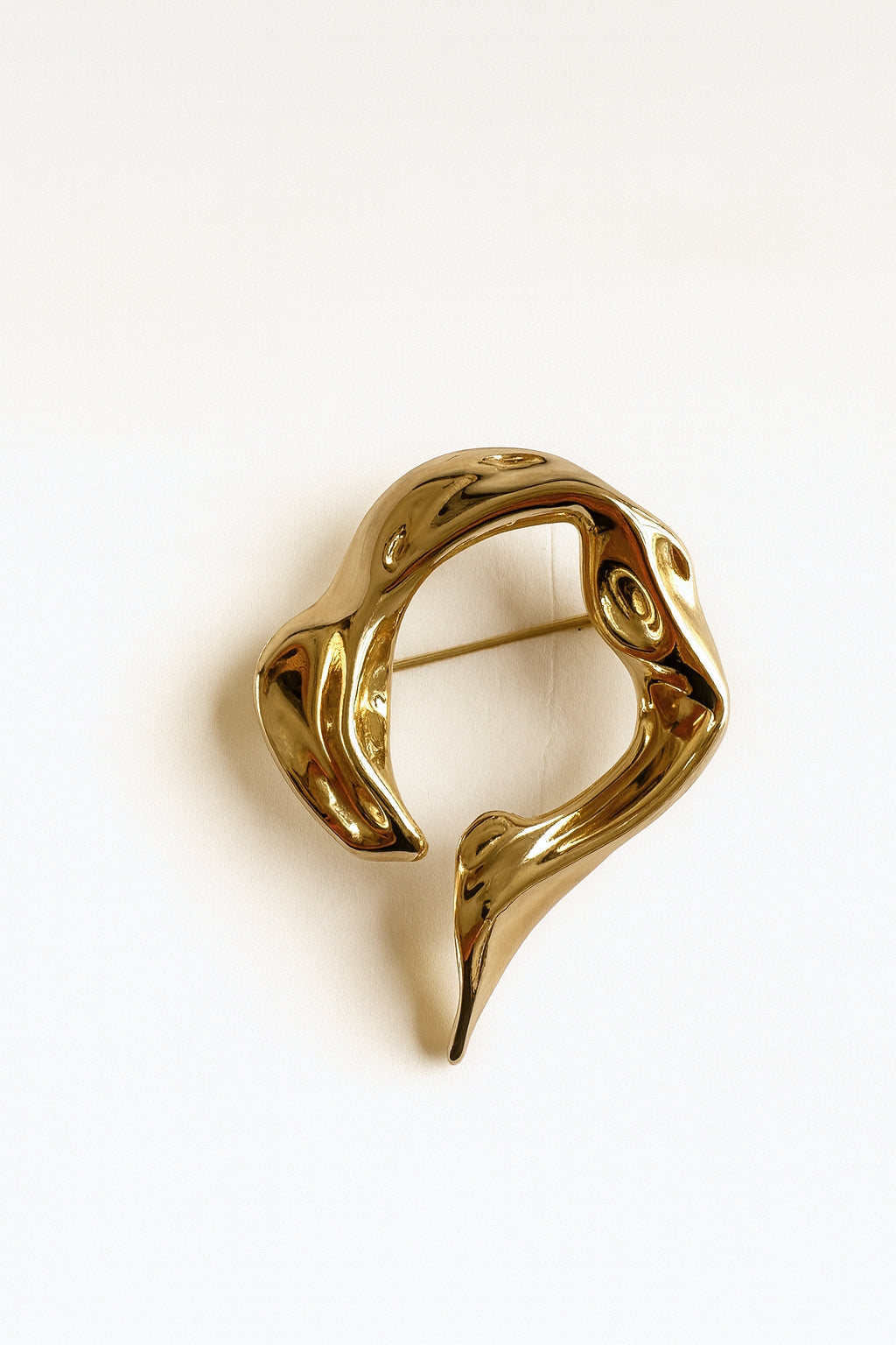 Tilføj et strejf af moderne elegance til dit look med denne iøjnefaldende broche. Brochen er designet med et flydende, abstrakt og skulpturelt motiv og har en smuk, højglanspoleret guldfinish, der fanger lyset.