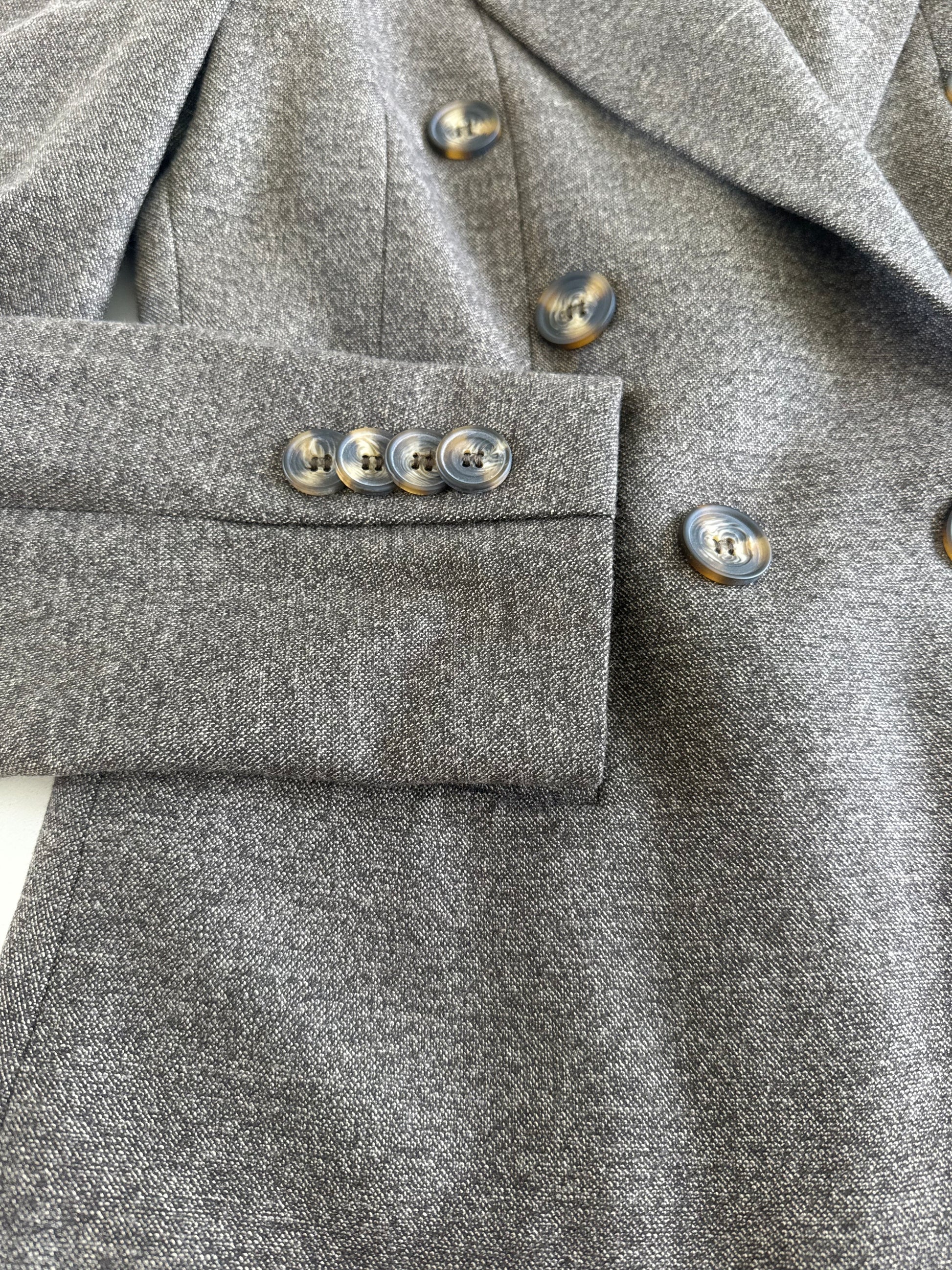 Detaljer: Metalliske knapper, klassisk revers og lommedetaljer