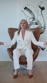 En ikonisk, dobbeltradet blazer i ivory, skabt til kvinder der ønsker et sofistikeret og selvsikkert udtryk. Den elegante silhuet smyger sig om kroppen og fremhæver formerne – med en pasform der balancerer komfort og struktur.
